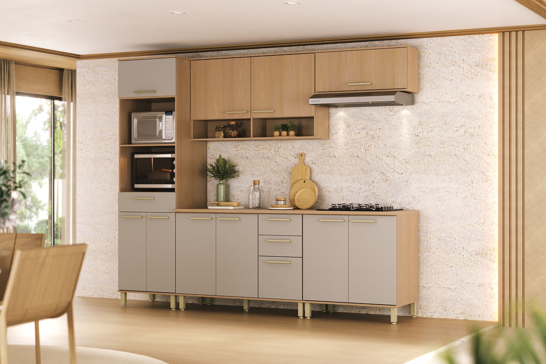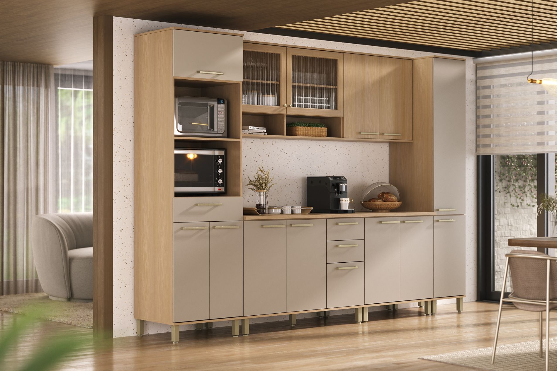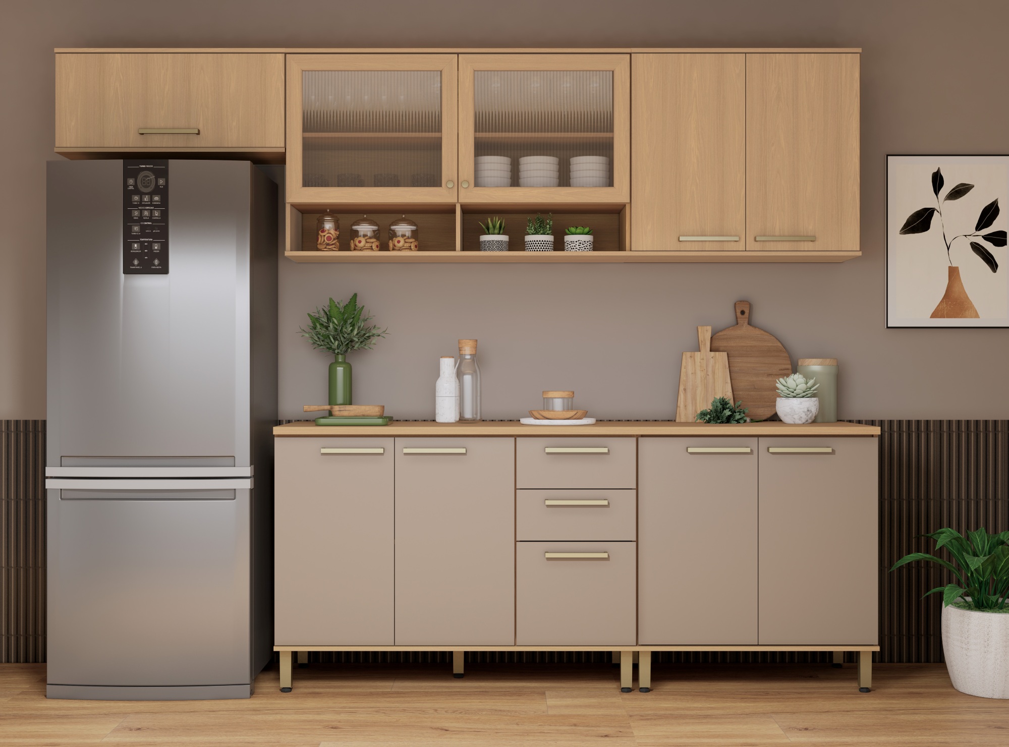 Cozinha e Bancada para IlhaA Cozinha Duna une o aconchego do Freijó com a sofisticação do Cinammon em um design funcional e elegante. Seus módulos versáteis se adaptam a diferentes espaços, enquanto o vidro canelado adiciona leveza e movimento ao ambiente. Inspirada nas formas suaves das dunas, é a escolha ideal para quem busca beleza e praticidade no dia a dia.